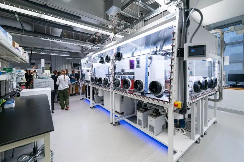 BayBatt 电池技术中心,是拜罗伊特大学电池研究核心实验室(Keylab),以灵活可重复的实验电芯制备与评估能力,持续驱动电池材料与储能技术创新落地。作为全球领先的惰性气体保护系统制造商,布劳恩(MBRAUN)为其量身打造了一整套定制化设备集群,构建起覆盖全流程的闭环研发体系,助力实现从材料开发到电芯制造的高效精准转化。带有惰性气体传输通道的手套箱集群示意图01洁净安全的操作环境布劳恩提供的手